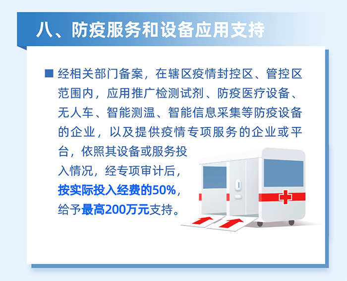 14.支持轄區科技企業圍繞疫情產生的新需求自主立項、先行投入,研發測溫、消殺、運輸、疫情動態監測等人工智能科技抗疫產品,對在2022年2月1日至4月30日期間,將企業自主研發的人工智能科技產品無償應用于南山區公共場所進行公益性疫情防控工作的,按照不超過其上一年度抗疫相關產品研發投入總額的20%且不超過無償應用產品的總價值給予資助,每家企業資助最高不超過20萬元。(責任單位:區科技創新局)