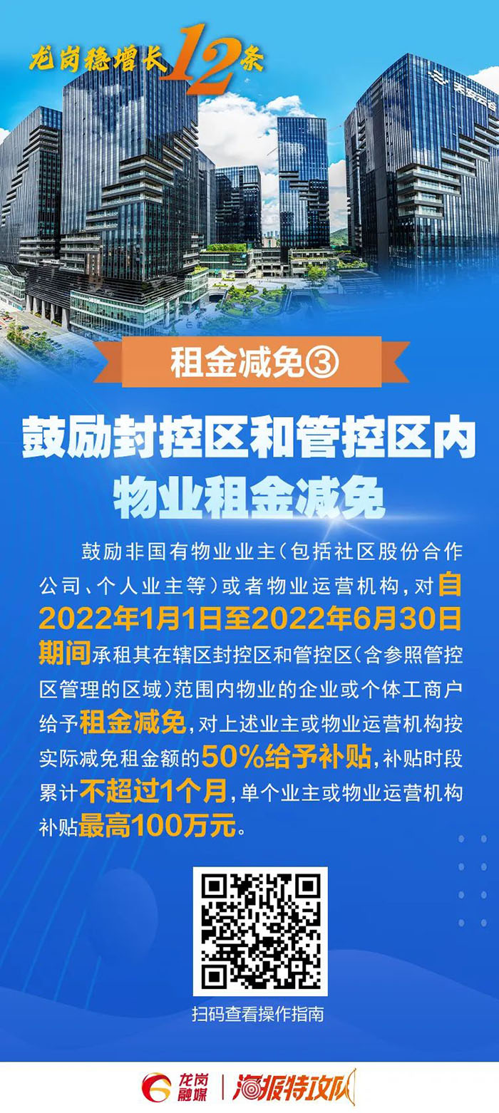 3.符合條件的國家高新技術企業、上年度科技型中小企業、規上重點服務業企業、規上工業企業、規下工業樣本企業、建筑業企業、文化體育旅游企業,自2022年2月1日至3月31日期間,其租用的社會物業,所在位置被劃為南山區封控區、管控區(含參照管控區管理區)的,按50元/平方米·月的標準給予一個月租金補貼,企業實際支付的租金低于補貼標準的,按實際支付的租金給予補貼。對于規上工業企業、規上重點服務業企業,每家企業補貼最高不超過50萬元;國家高新技術企業、上年度科技型中小企業、規下工業樣本企業、建筑業企業、文化體育旅游業企業,每家企業租金補貼最高不超過20萬元。(責任單位:區科技創新局、區工業和信息化局、區住房建設局、區文化廣電旅游體育局)