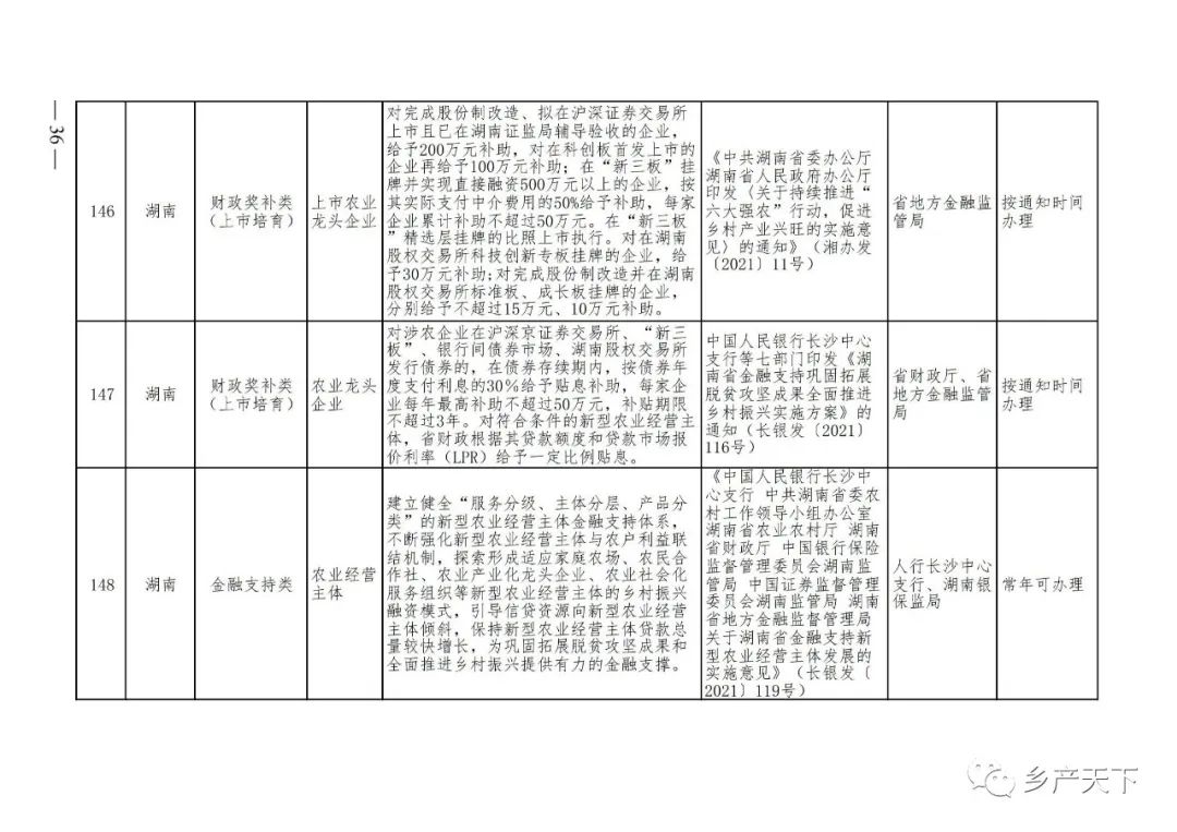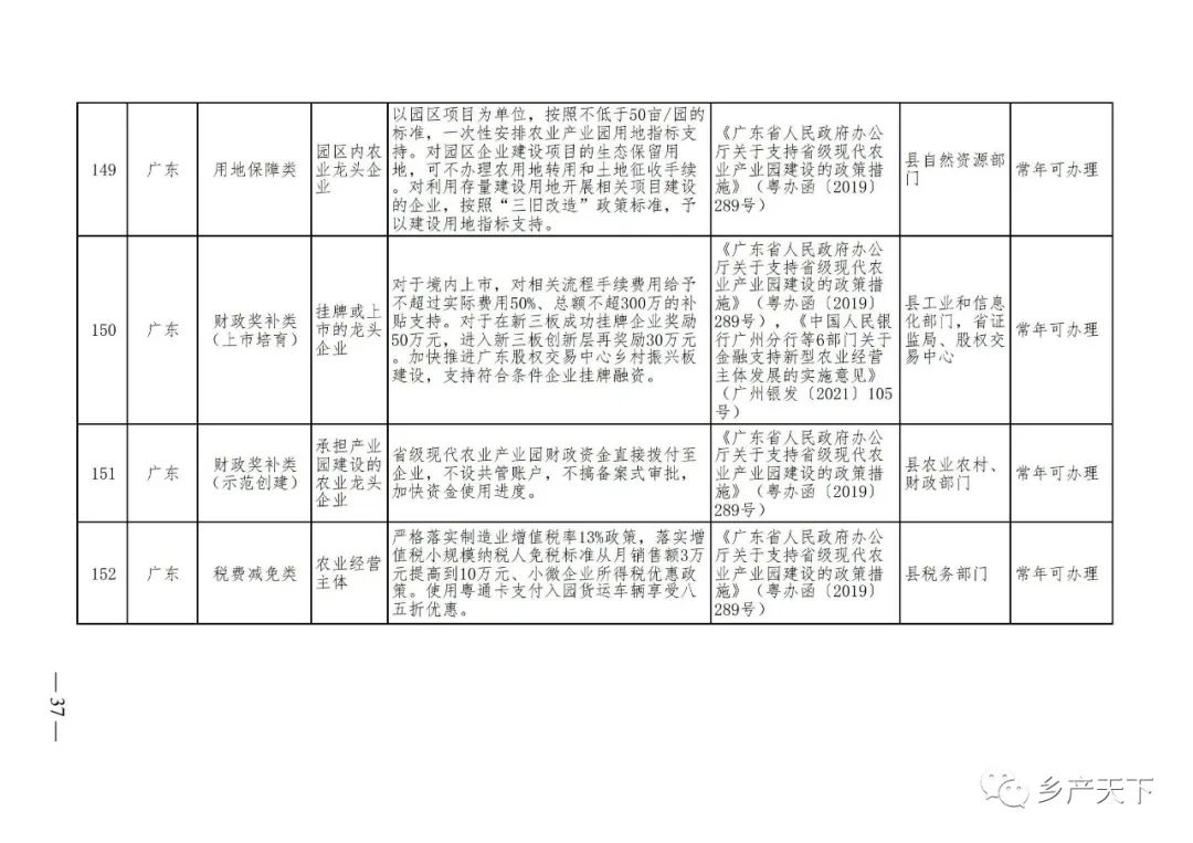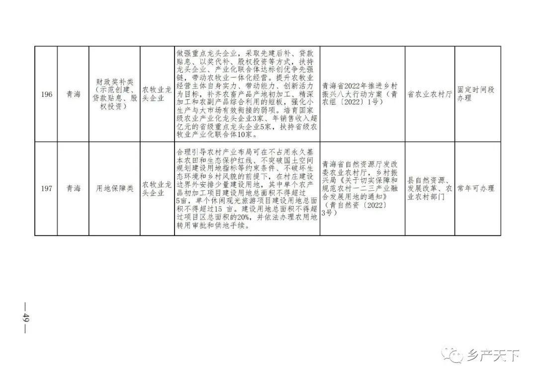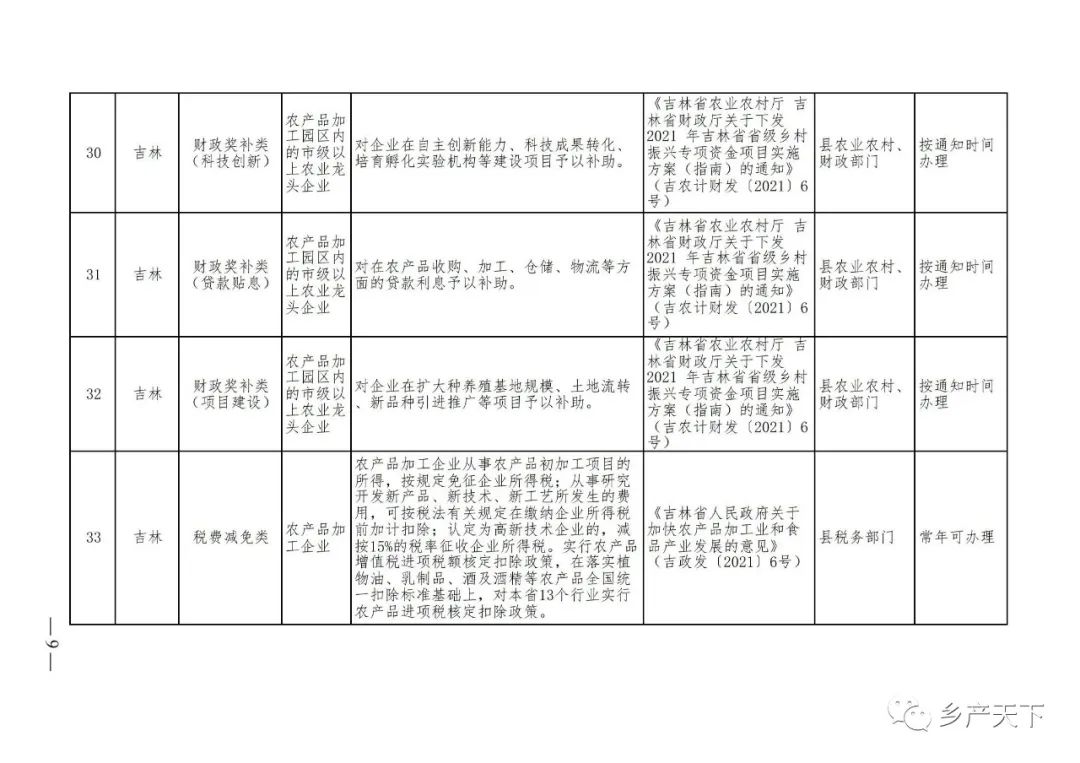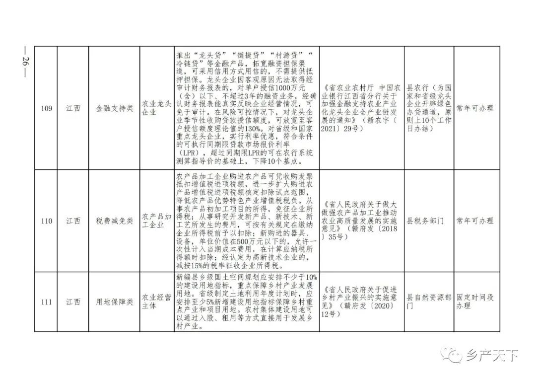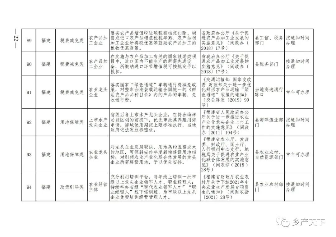 《清單》按照“政策類別、支持對象、具體內容、政策依據、辦理部門、辦理時間”進行梳理,共涉及“財政獎補、金融支持、用地保障、稅費減免、水電優惠、政策引導”等六大類229條政策。《清單》通知,各地支持政策發生變化,要及時反饋,鄉村產業發展司將定期更新發布。