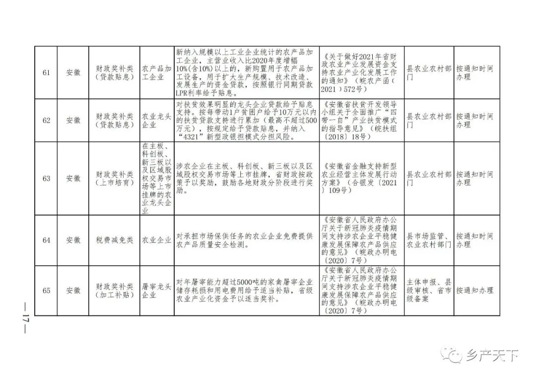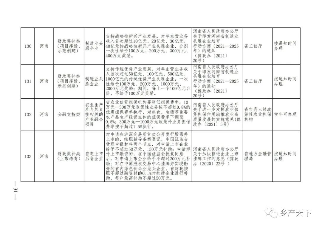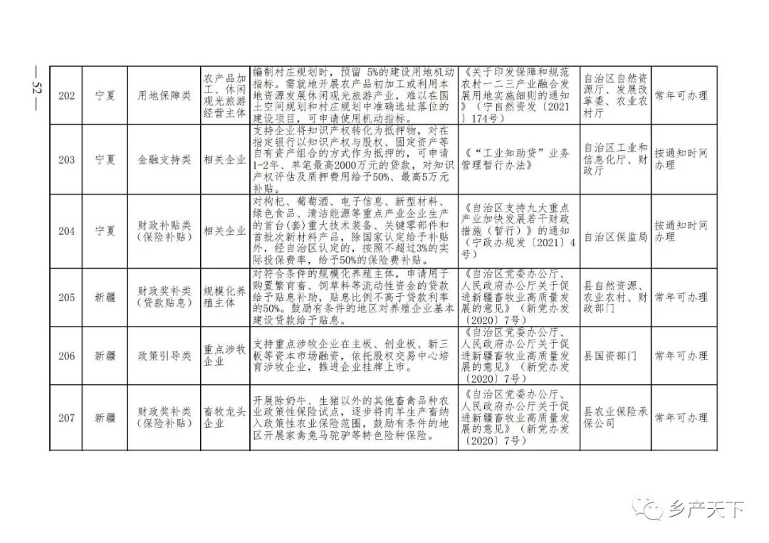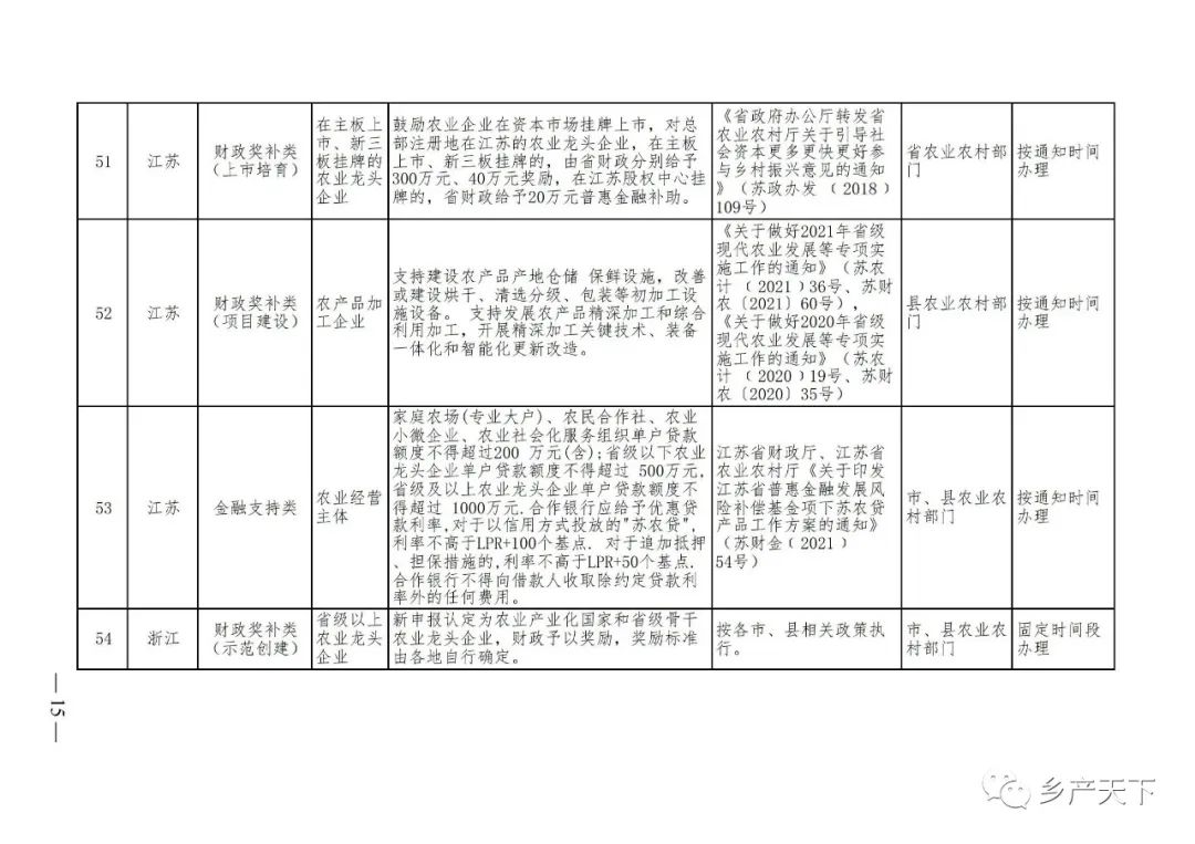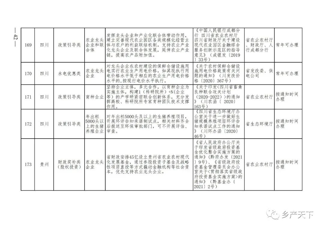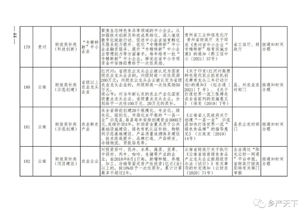 《清單》按照“政策類別、支持對象、具體內容、政策依據、辦理部門、辦理時間”進行梳理,共涉及“財政獎補、金融支持、用地保障、稅費減免、水電優惠、政策引導”等六大類229條政策。《清單》通知,各地支持政策發生變化,要及時反饋,鄉村產業發展司將定期更新發布。