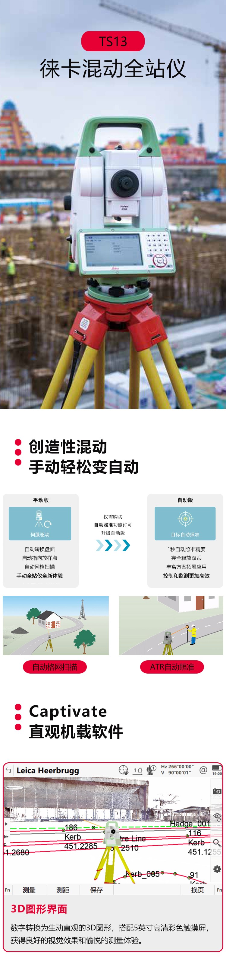 徠卡TS13自動型全站儀是徠卡全站儀為響應(yīng)用戶多樣化的自動化需求所推出的自動全站儀,在保持一貫的高品質(zhì)基礎(chǔ)上,標(biāo)配自動目標(biāo)照準(zhǔn)(ATR)和自動量高功能,還可按需靈活選配自動搜索和棱鏡鎖定功能。搭載Captivate機(jī)載系統(tǒng),暢享豐富本地化應(yīng)用。真正做到“把錢花在刀刃上”。